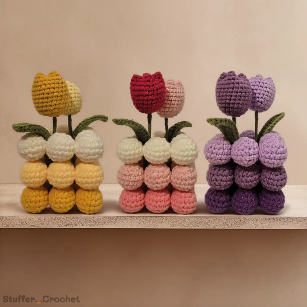 Handmade Touch: Carefully hand-crocheted with detailed tulip blooms and a textured vase, thoughtfully designed to create a cozy and eye-catching display.